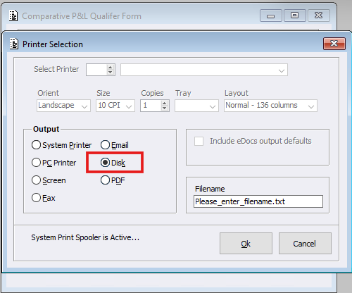 After generating the Comparative P&L Report, users now have the ability to output this report to DISK, meaning users can save the data to file enabling external processing.
