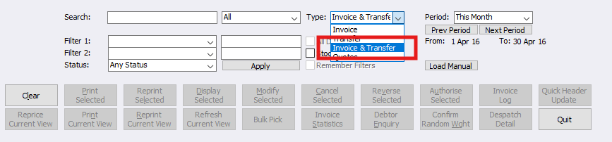 In further support of a newly created Configuration for Invoice Maintenance called ‘Include Both Invoice and Transfer’, now with the configuration ON, an additional Search Type called ‘Invoice & Transfer’ will load. Users can then select this type option within Invoice Maintenance, to search for both Invoices and Transfer Invoices at the same time. Users can still search for Invoices or Transfers independently by selecting ‘Invoice’ or ‘Transfer’ type options.