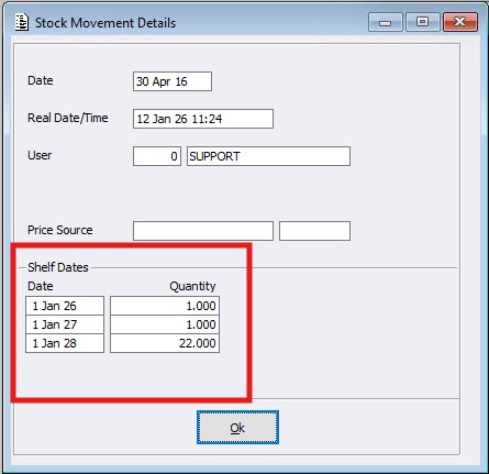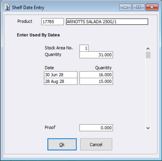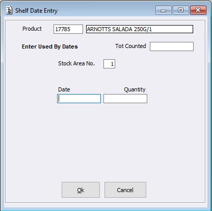 If Shelf Dates are configured, when a Stock Receipt / Adjustment is processed the user will be prompted with the Shelf Date Entry screen to key in the dates / quantities. (If configured to mandatory, the entered dates / quantities must fulfil the line quantity.)
