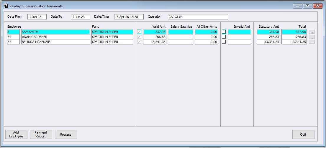 - Selecting Yes will open the Payday Superannuation Payments screen. Once this is completed, upon selecting Quit, the system will return back to the Payroll Sheet process