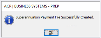 The system will then advise that the file was created successfully. On pressing OK the system will clear the displayed Superannuation Payment data.